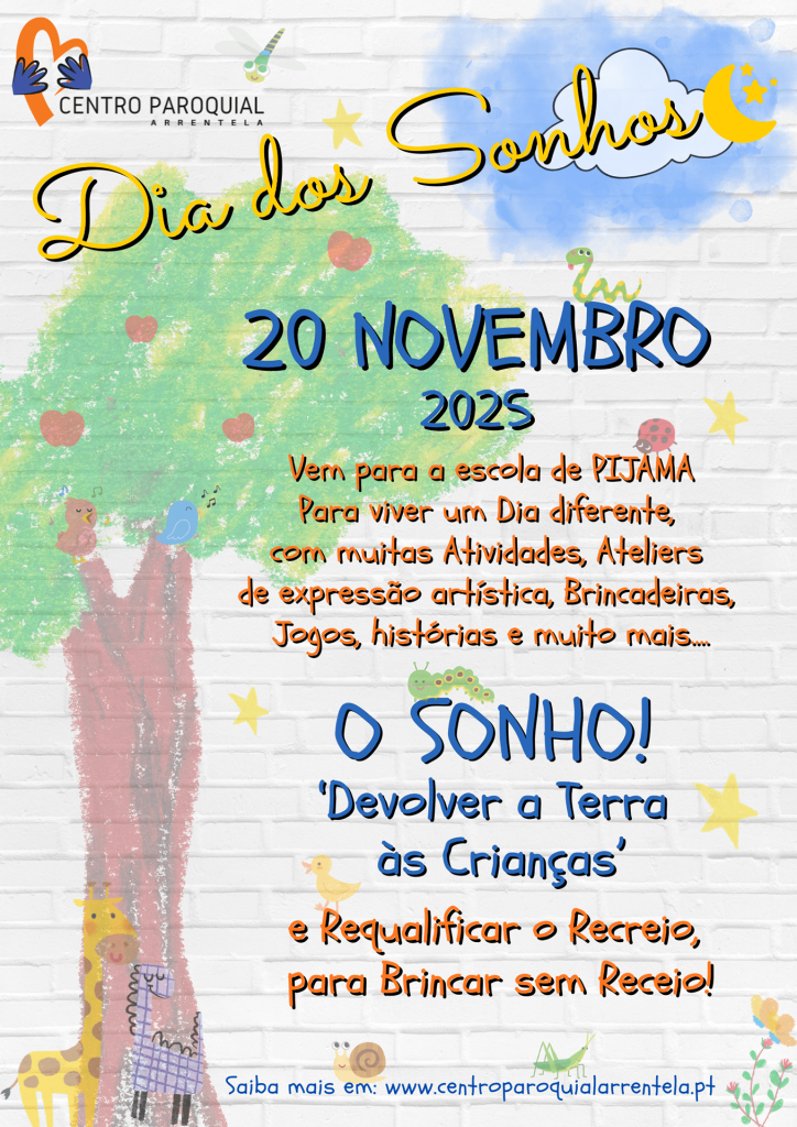 Assim, no dia 20 de Novembro, celebramos o “Dia dos Sonhos 2025”, nesse dia as crianças virão de Pijama para a escola e irão ter um Dia Diferente, com atividades, diversos ateliers de expressão artística, brincadeiras, histórias e muito mais!